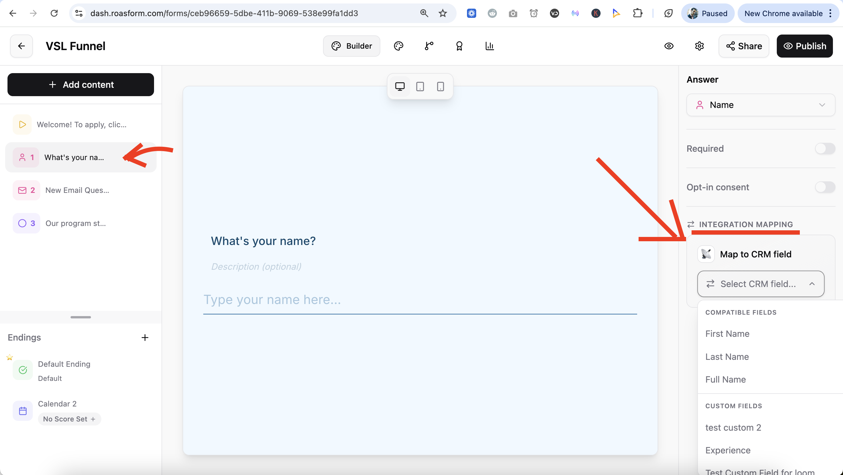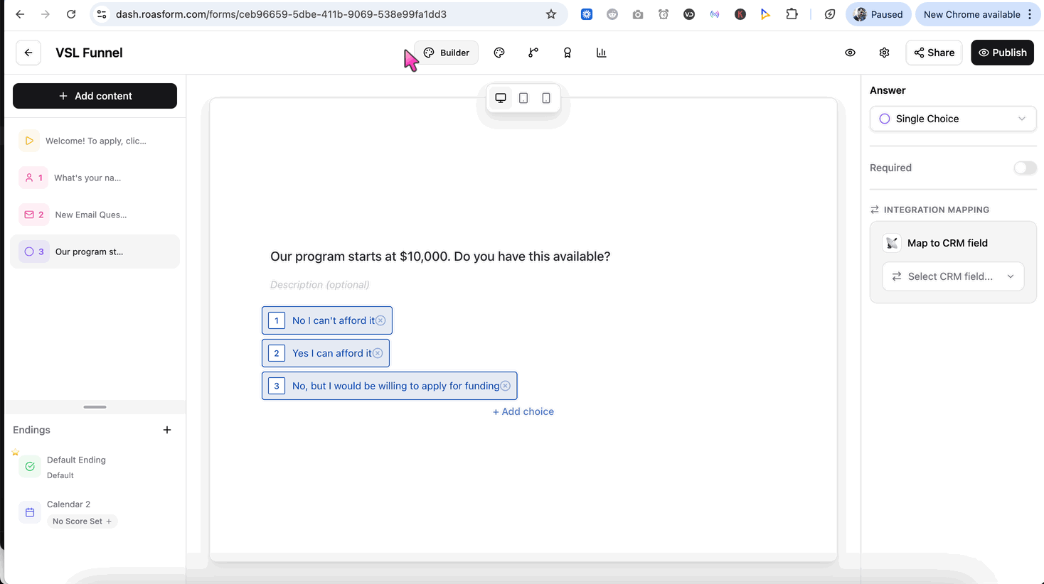 From the Builder tab, go through each question and map the field to a corresponding standard or custom field in GoHighLevel.