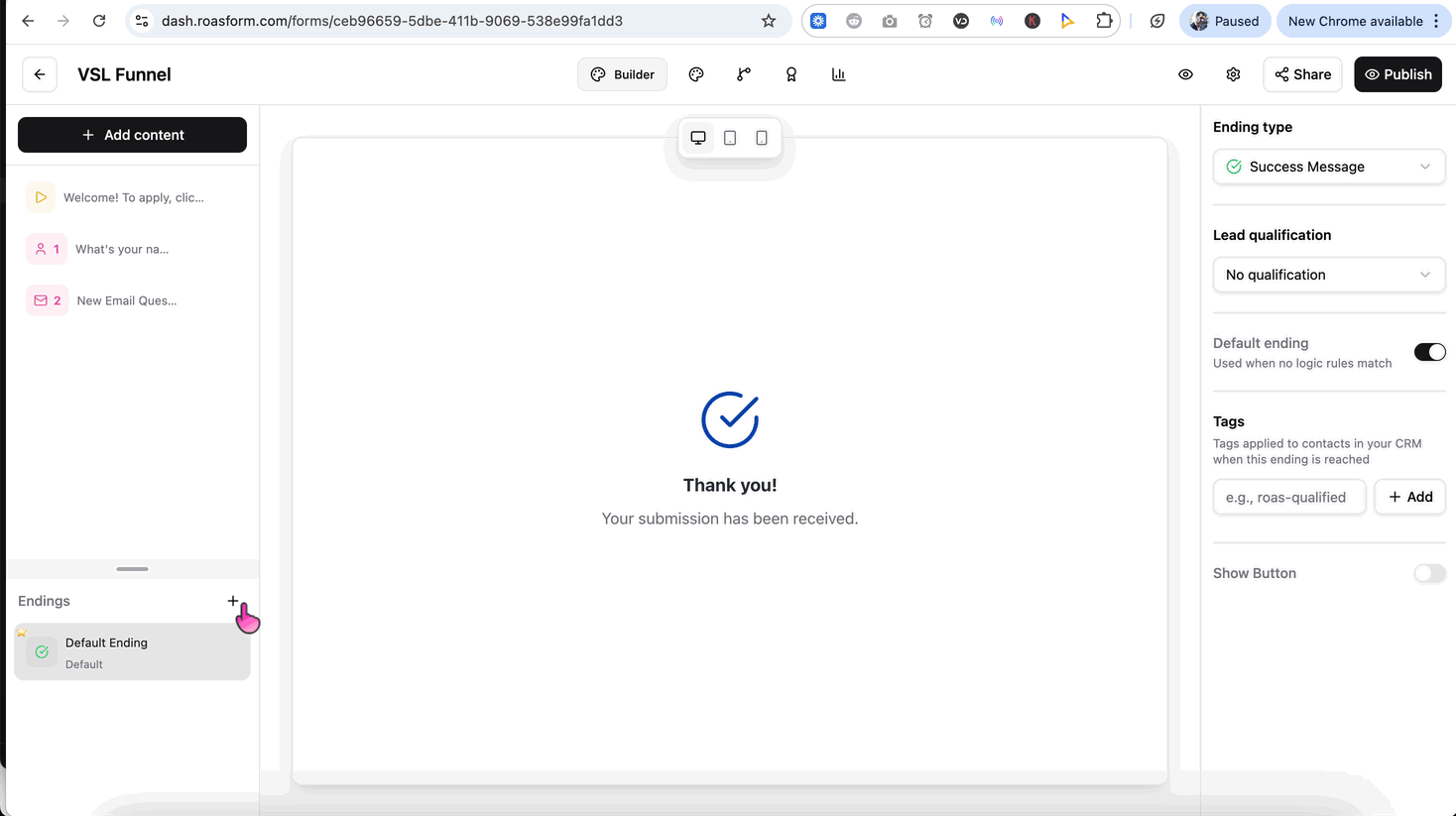 Choose your ending type (i.e URL Redirect or Success Message) and select a Lead Qualification status